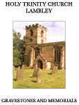 "Holy Trinity Church Lambley: Gravestones And Memorials", contains details of all burial monuments in the churchyard with memorial inscriptions transcribed in full. Almost two hundred deceased individuals are indexed alphabetically, graves are numbered, and location is by grid reference to a plan included in the book. The stones' physical appearance and condition are also described. The publication has 72 pages in A5 format, illustrated with colour and black and white photographs.